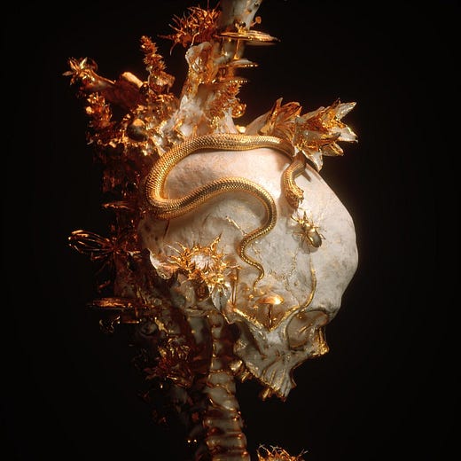 Bill: So many of these elements stem from my love for religious iconography in art, cathedral decoration and humanity’s obsession with precious metals. A very dark subject can be decorated, elevated and celebrated purely by the way it is presented and adorned almost eliminating the sense of fear and despair that exists around death.