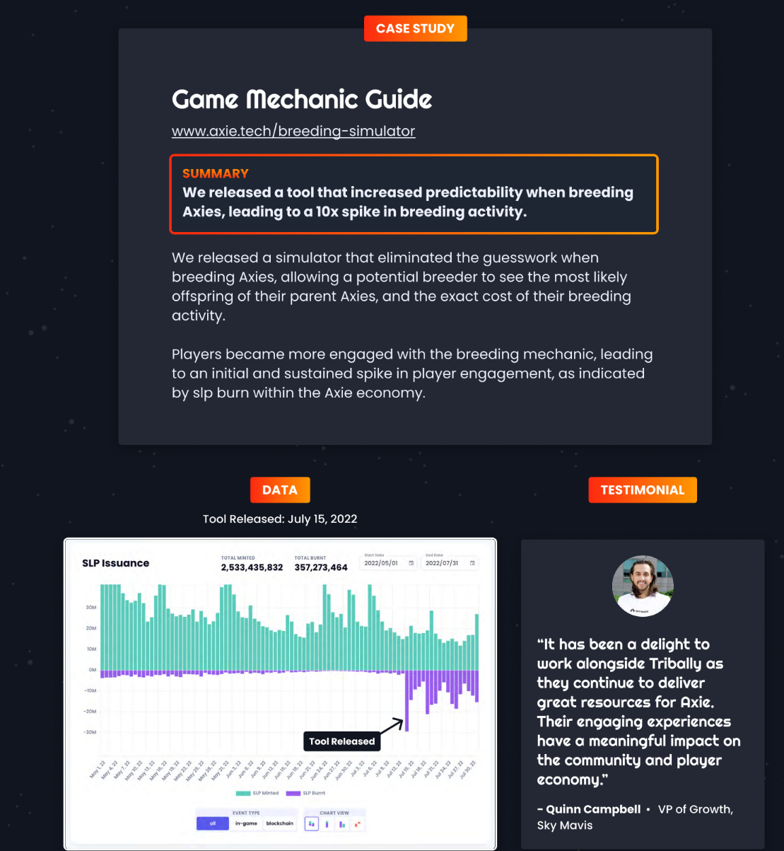 Prior to them rebuilding the Axie website, they built Axie.tech which acts essentially as a hub for all facets of Axie Infinity: from everything esports to even breeding calculators. They then proceeded to become the official tooling partner for Axie Infinity in 2022 and are now directly working with the dev team over at Sky Mavis on building the community infrastructure for Axie.