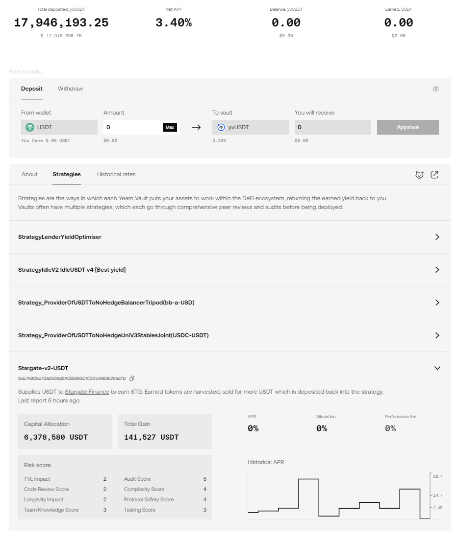 This kind of modular building is why a lot of people refer to DeFi as “Money Legos” and where Yield Farming strategies originate from. Using multiple different protocols in a particular order to maximise returns on deposited capital. This is one of the strategies that Yearn.Finance uses for $USDT deposits.