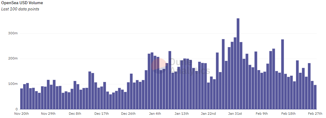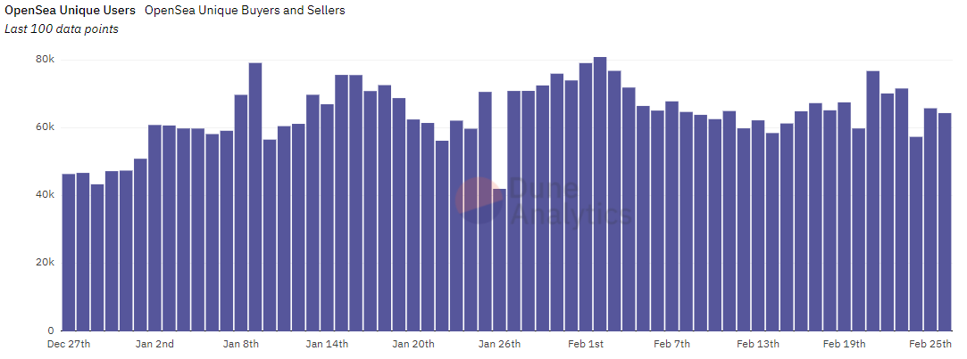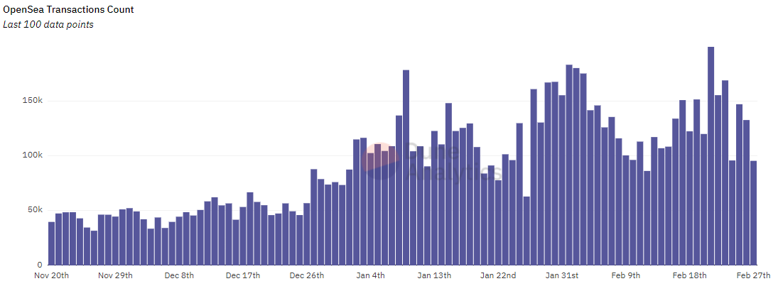 Overall, things could be worse. Given the current geopolitical state of, well, the world, you have to be satisfied with whatever you can get at the moment. Regardless, the past week went pretty well. Volume was partially fueled by Invisible Friends, which has already done 22,000e in volume. Transaction counts seem rather low but users remain as constant as ever, signaling that some traders are more checked out than usual. The market will likely remain a bit cautious until there is more clarity in eastern Europe.