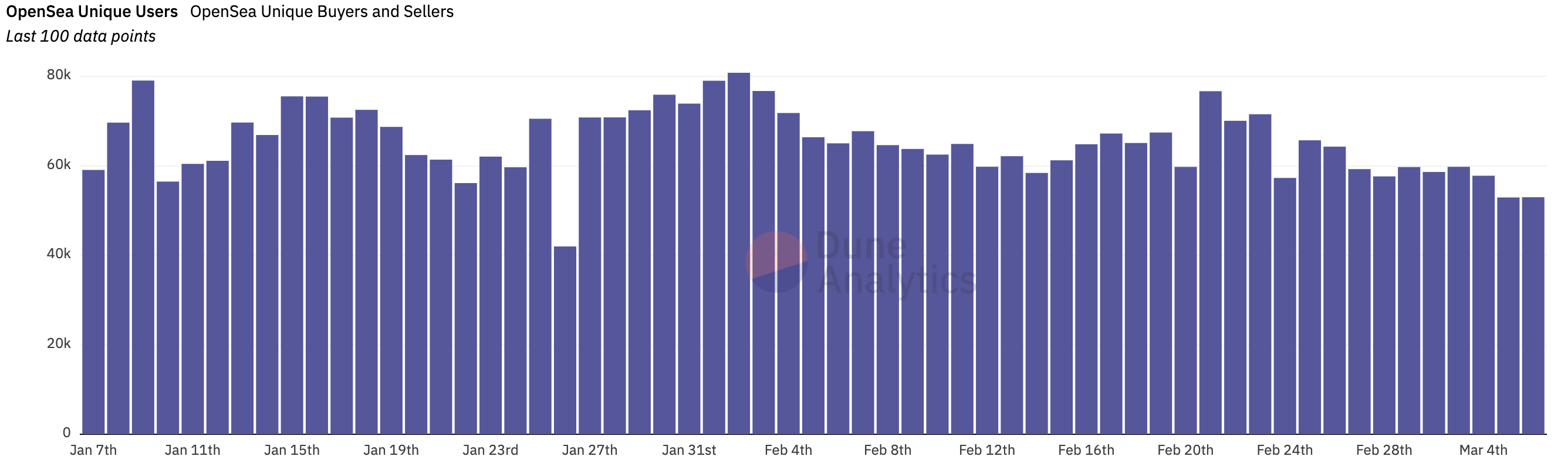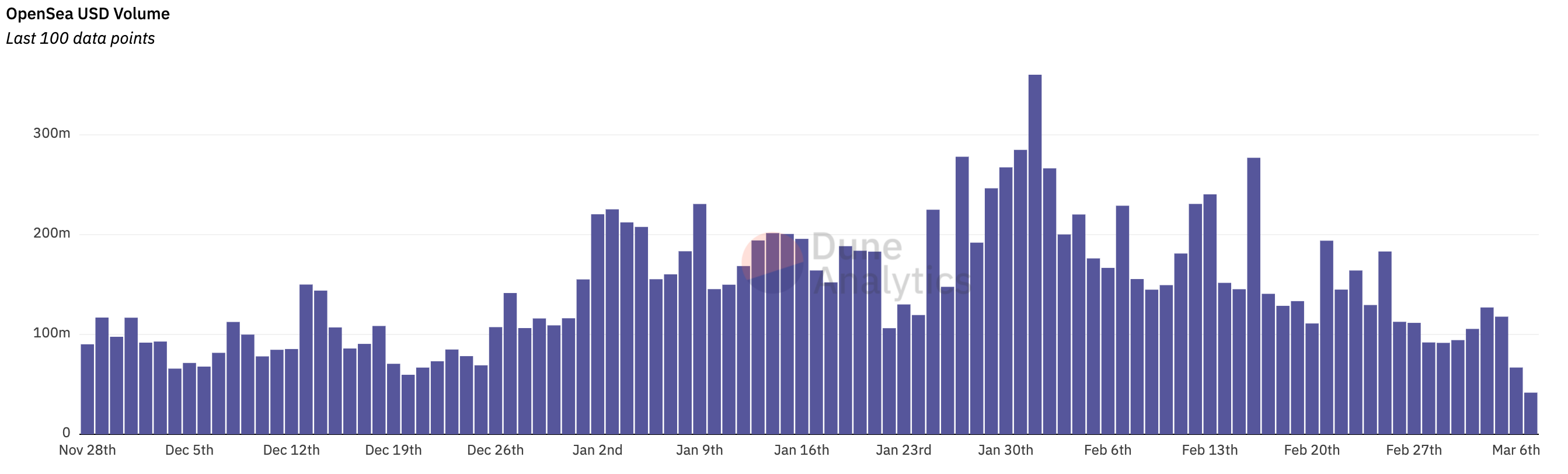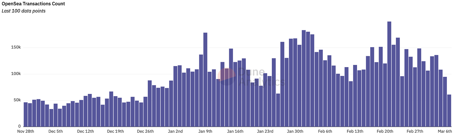 There is a noticeable lack of liquidity in the market that has been around for the past few days. General sentiment seems to be that liquidity won’t be returning in droves anytime soon and things may yet decline. March 6th was the lowest OpenSea volume since mid-December and while users remain fairly constant, transaction counts have followed volume lower. Regardless, there are still opportunities, although they may come few and far between. This isn’t surprising, as it’s been a few weeks since the geopolitical drama started, the effects of which will continue to roll over markets of all kinds in the coming weeks. Make your bets cautiously moving forward.