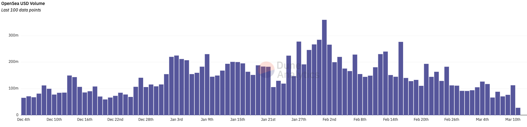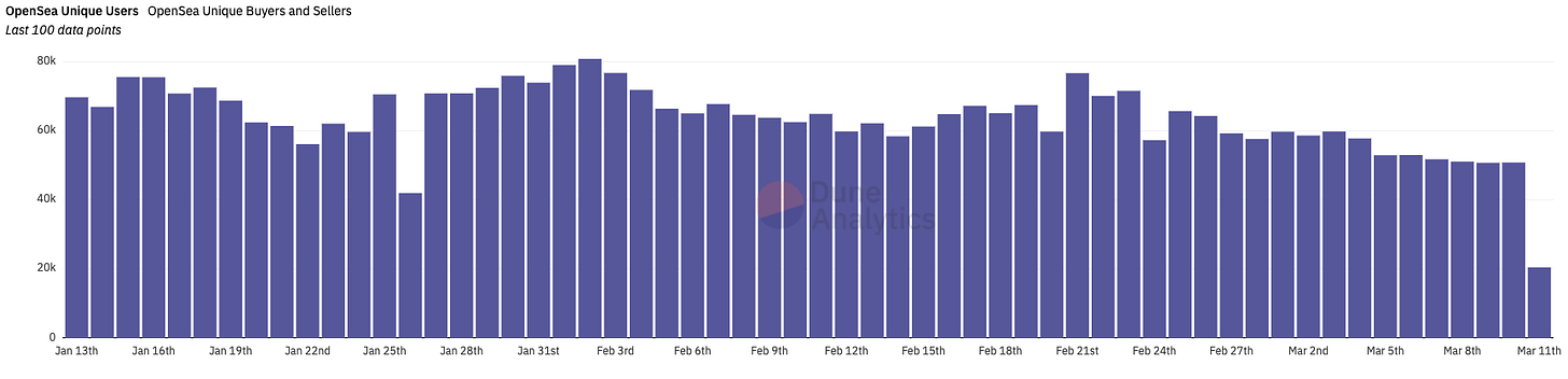 While volume is still low, sentiment isn’t quite as negative as it was last week. We still saw plenty of new project releases this week, a number of which performed quite well. Yuga Labs acquisition of Punks and Meebits brought increased volume to all relevant collections. GNSS did over 2,000e in volume traded during its first hour alone, showing that the market is still alive and well, albeit less frequently. Although unpredictable macro factors could still lead the market lower, the NFT market showed a good bit of robustness this week.