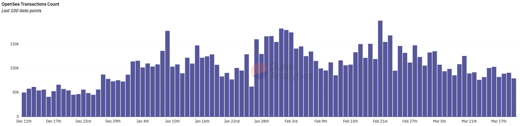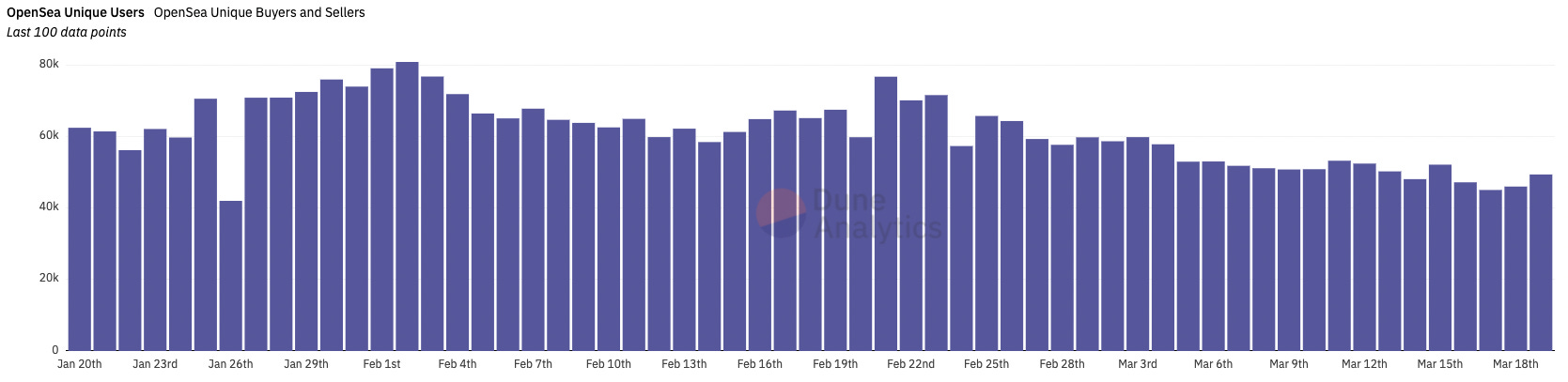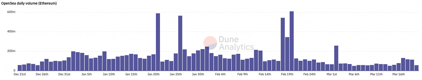 It’s been a huge week for news and announcements, highlighted by $APE and Otherside. Aside from that, things seem a bit quiet and statistics are neither here nor there. No huge mints moved the market in the past few days, although some collections like ZombieClub, Muri and Martian Premier League have seen a couple thousand Ether in volume over the past week. While the release of $APE coincided with a run-up in the price of BTC and ETH, macro and micro conditions are still questionable at best. Whether or not the fresh injection of cash into the pocket of every ape and mutant restarts an NFT run remains to be seen.