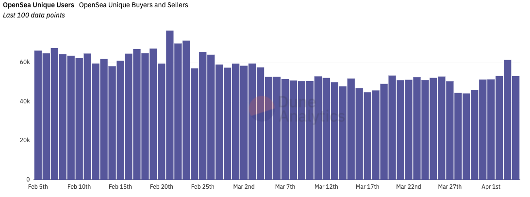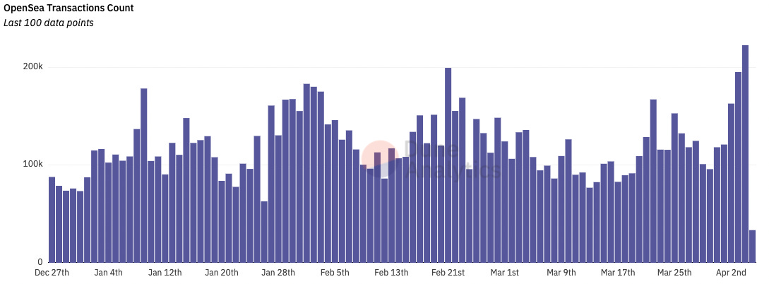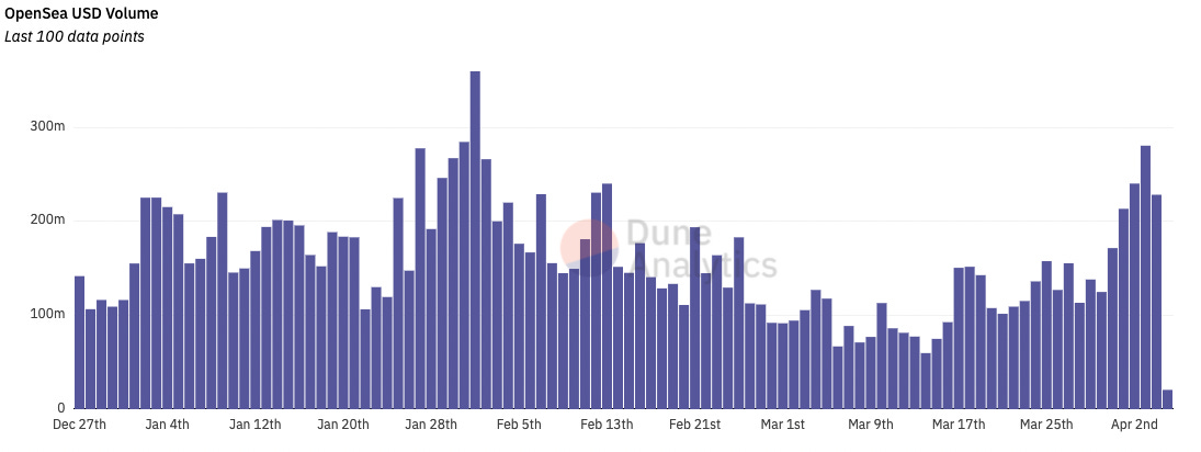 And just like that, we’re back. Volume and transaction counts surged over the weekend as traders rotated into and out of Azuki and BEANZ - the two collections have racked up nearly 40,000e in volume over the past seven days. Sticking 2 BEANZ in the pocket of every Azuki holder early on the morning of the 31st was enough to kickoff a fantastic run of days, notching the highest volume day since late January and the most daily transactions in more than 100 days. Coin markets could impact overall market liquidity if they continue upwards and we remain in an uncertain macro environment. Enjoy the volume while it’s here.