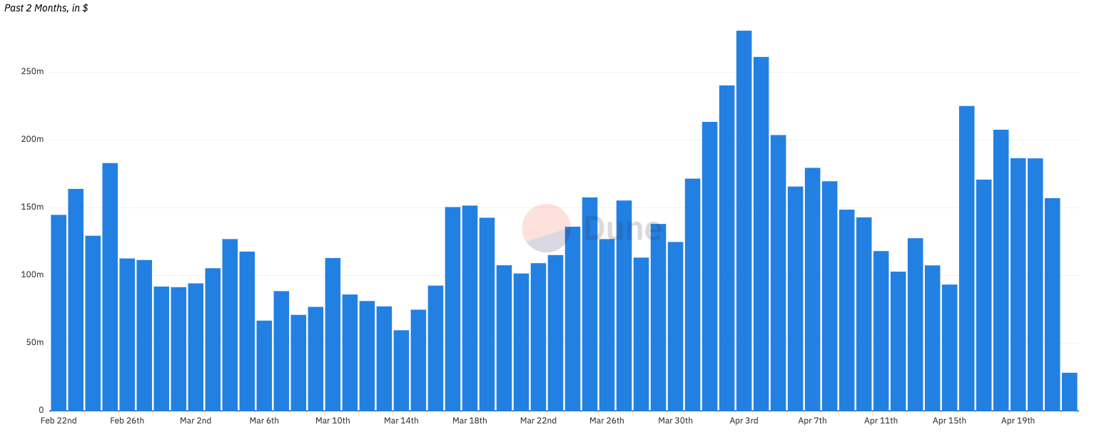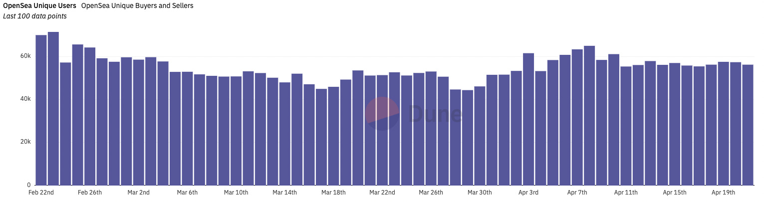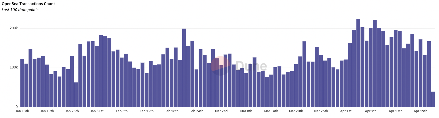 Things got a bit slow after the Azuki-fueled early April period but Moonbirds has fixed that (at least in terms of volume). When that volume stops flowing predominantly through Moonbirds is anyone’s guess, but it has to happen eventually (right?). There are a number of other eye-catching events coming up: Akutars mint today and MNLTHs should be revealing. Then we have the unknowns: BEANZ reveal and the BAYC land sale. Liquidity could get tight for smaller projects if any of these things happen to overlap.