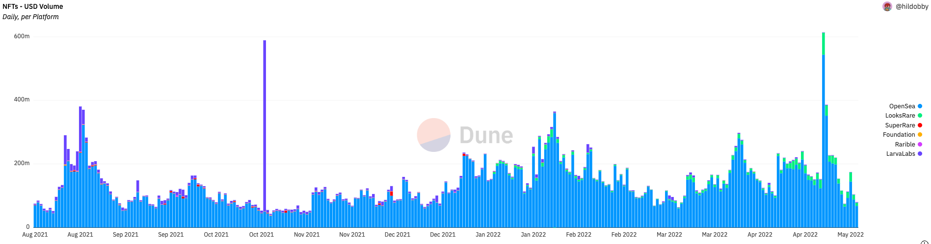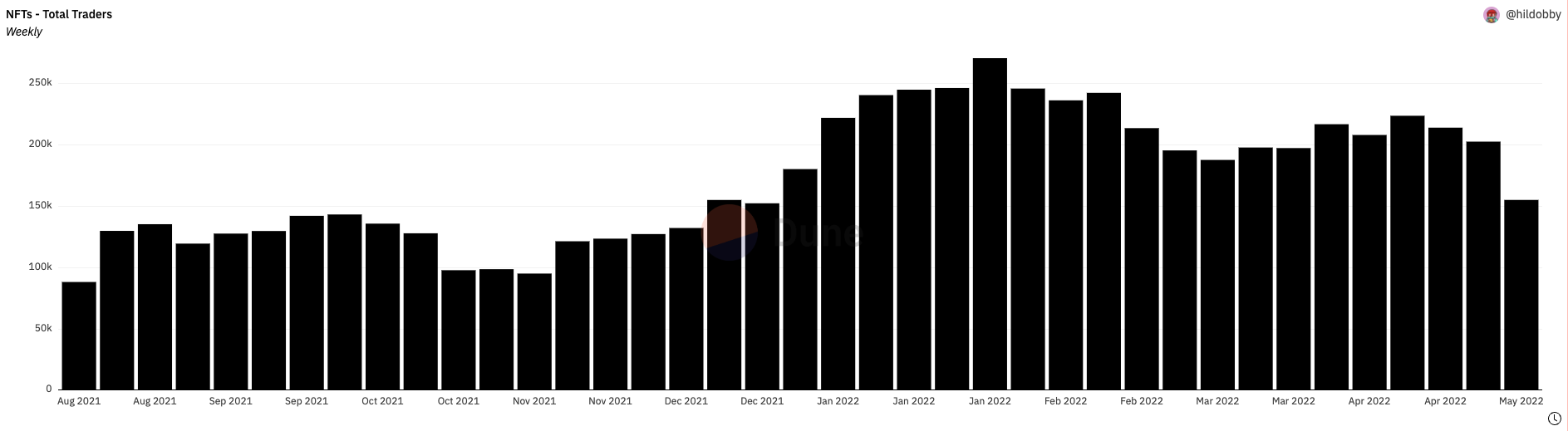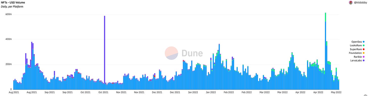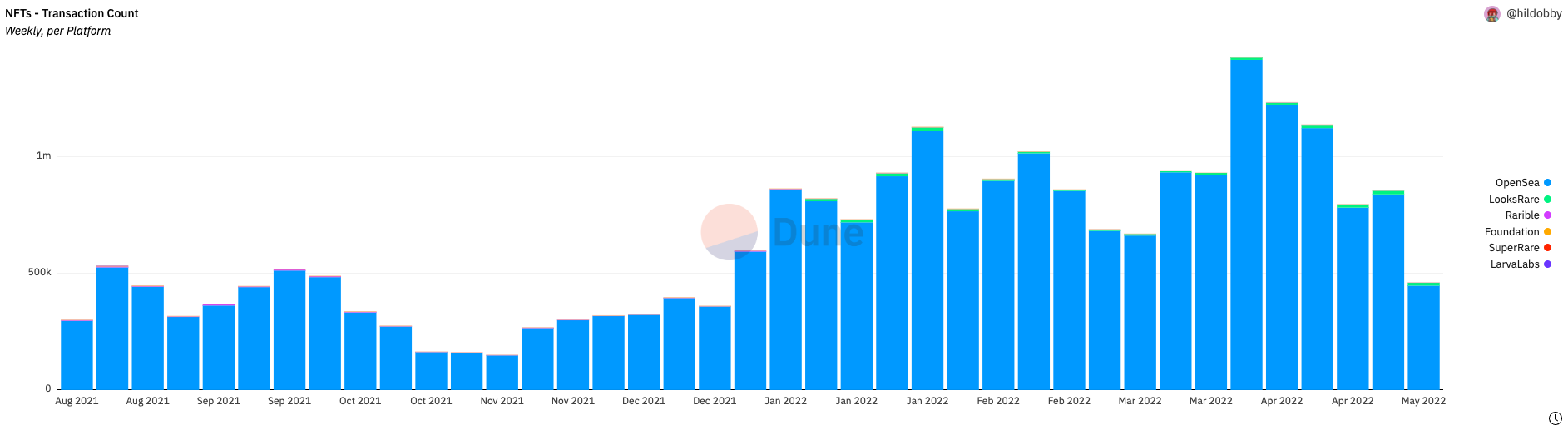 We all know things are a bit testy right now, but I come baring a glass half full. While volume is down, it’s not as low as we saw in parts of October and November ‘21 (yet). Weekly total traders (regardless of marketplace) have more than doubled over the past nine months from around 88,000 in mid-August to over 200,000 in April and May. There are a lot more people buying Ethereum NFTs right now then at any time that isn’t Q1 2022. These people are continuing to transact at an increasing rate with last week (and much of November) being notable exceptions.