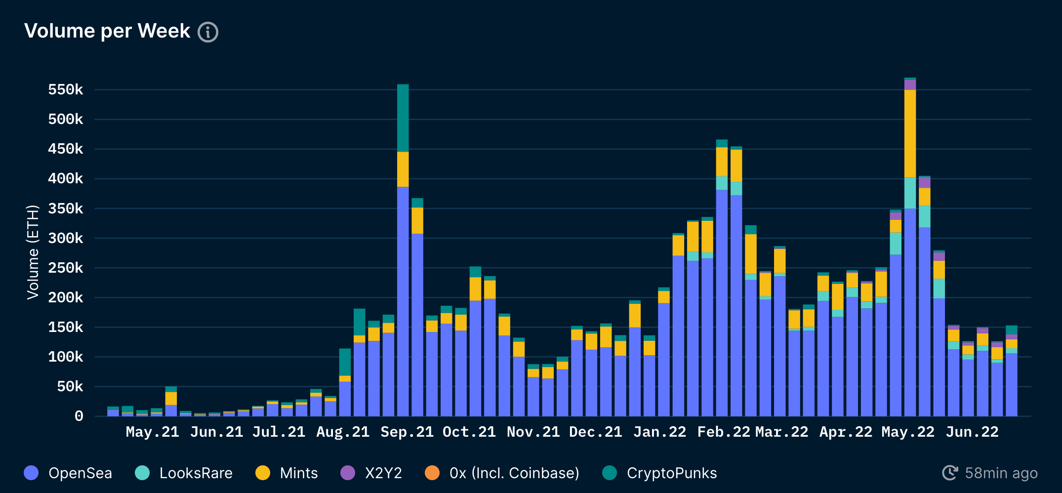 With Ethereum at a level lower than many picture traders have experienced, blue chip collections like Punks and certain Art Blocks have found new buyers who may not have been interested at such high USD levels. Collections like Clone X and Moonbirds dipped during the sell-off but have rebounded a bit in the days since. While things could certainly go lower, some collections are as cheap in USD as they were around launch, giving those who missed them the first time another opportunity. Hopefully NFT NYC brings some attention back with interesting announcements.
