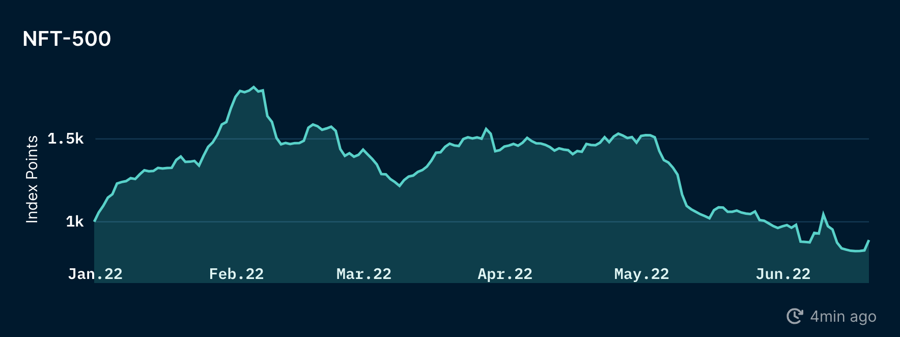 It’s been a rough month for NFTs. Volume is the lowest we’ve seen in about a year, but things have started to look up a bit. The past week has brought pain to the crypto market at large, but after coin prices stabilized a bit, more desirable collections seemed to find a bottom - at least locally. This can be seen in the tiny little uptick in the NFT-500 chart. It’s not much, but its what we’ve got.