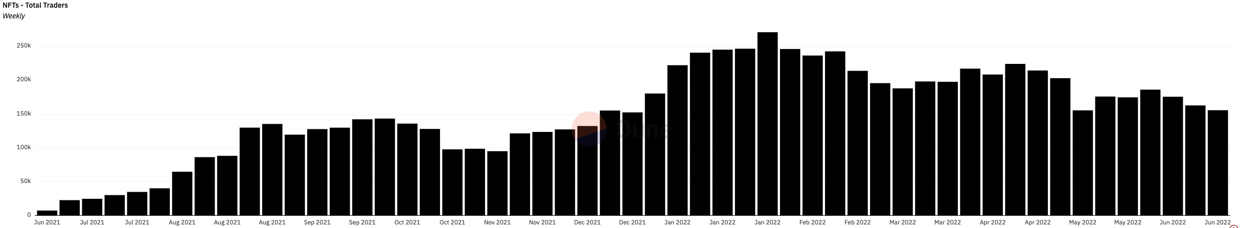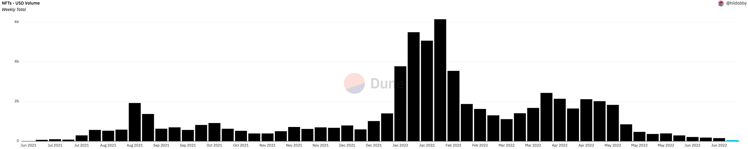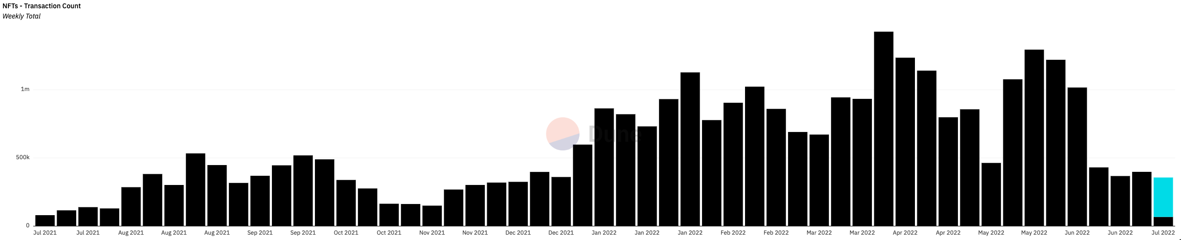 The month of June recorded the lowest total NFT volume on Ethereum since July 2021, coming in just above $1B. It’s a huge drop from the $4B of volume in May and makes the $17B total in January feel egregiously silly. Regardless, things continue chugging along and projects continue releasing (sometimes even good ones). Users and transactions have remained far more consistent than volume, although have not been unaffected - monthly transactions dropped from over 4M in May to 3M in June. The tweet below from NFTstatistics does a good job giving some context to what this means in practicality.