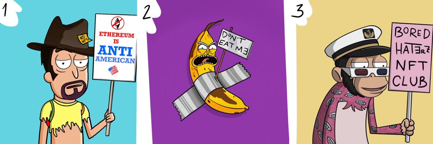 Allegedly created by 67-year-old “Mr. Peters,” God Hates NFTees backpacks off the viral protests staged by Bobby Hundreds at NFT NYC a few weeks ago with a collection of Rick and Morty style protestors. Their website sets out their manifesto, emphasizing their “4channer spirit” and private Discord community which culls those who don’t participate. The community is somehow “managed through a DAO,” although there are no further details on what they do or how. Regardless, the collection has seen nearly 2,500Ξ in volume over the past few days as the floor price shot quickly upwards. An interesting project to keep an eye on.