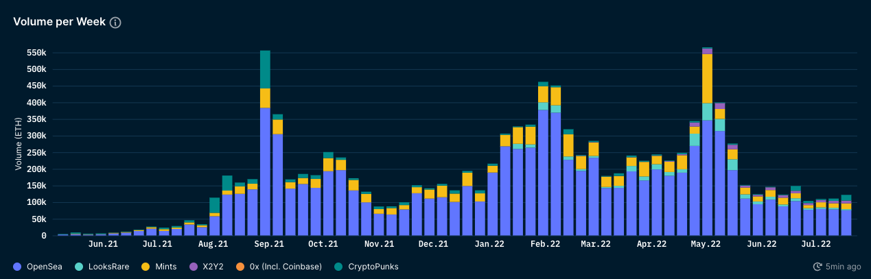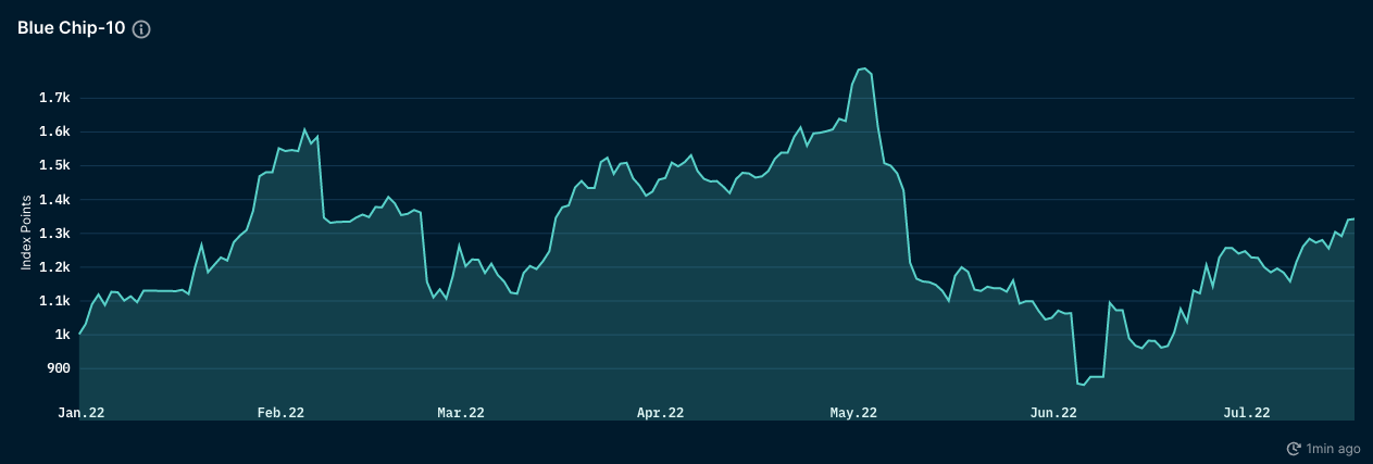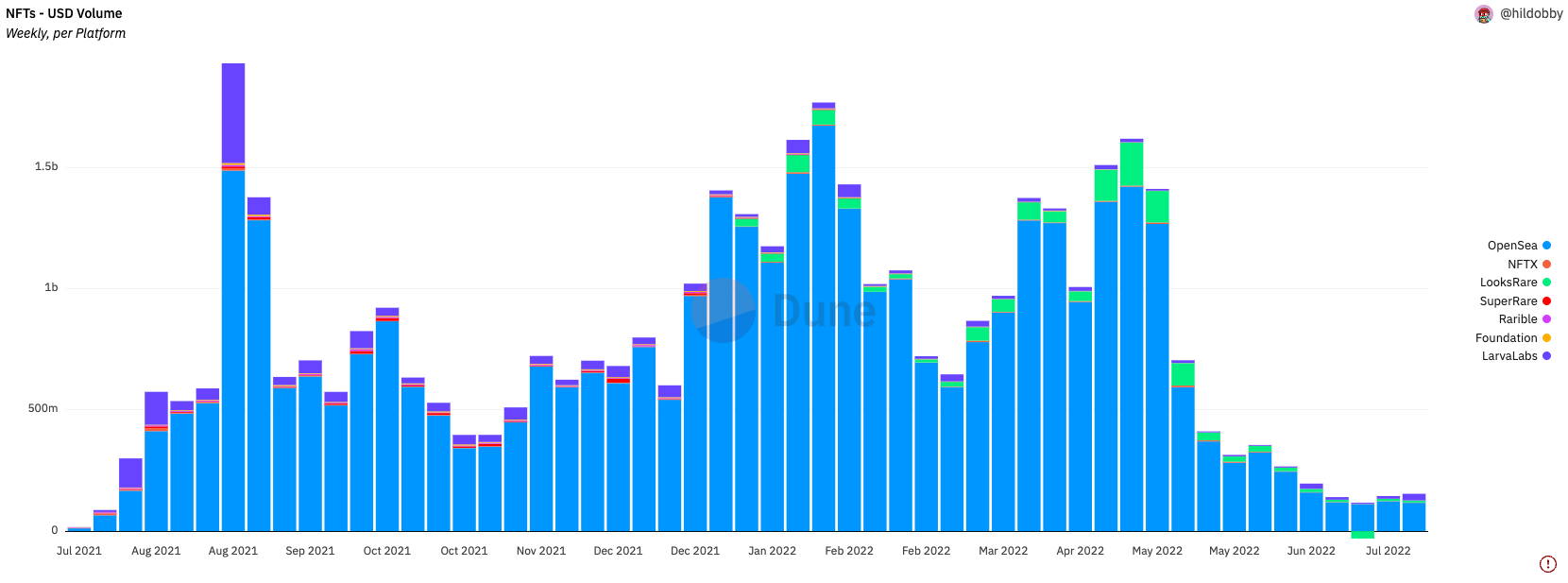 Although it hasn’t been the most entertaining few weeks, the market has been humming along at a steady pace since finding a local bottom in early June. The Nansen Blue Chip 10 index illustrates this bottom particularly well, as it is up nearly 50% since. Volume doesn’t look dreadful, at least when measured in Ethereum - we’re sitting around the same levels as November ‘21. When measured in USD, though, things still look rather bleak. Total volume in the month of June was painfully low compared to May and the months before and volume in July looks like it won’t even match June.