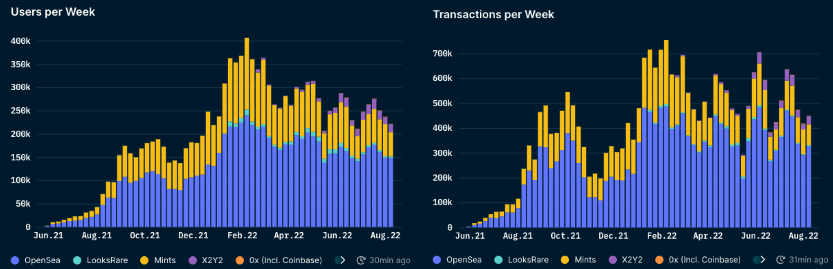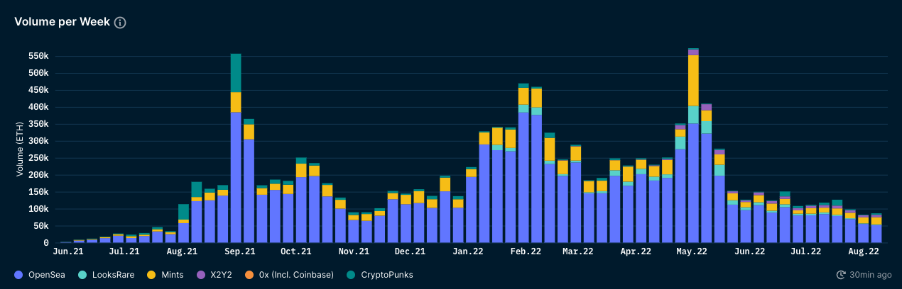 While Tuesday felt sort of busy and there have been a few interesting storylines to carry us through the past week, volume has shown no signs of returning - at least not in any meaningful sense. One reason to be optimistic about the upcoming week: some traders have scored big wins on projects like DigiDaigaku, Rare Apepes or Webaverse and that fresh capital could find its way into different projects across the board. Still, its hard to imagine seeing larger NFT volume until there is something eye-catching and new to get people excited. While there are certainly trades to be made right now, they remain few and far between.
