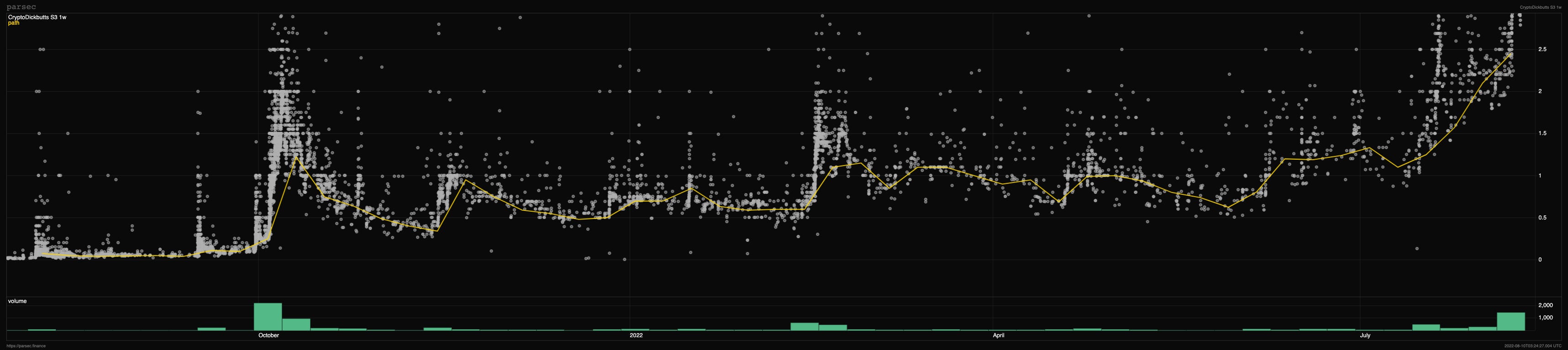 Everyone’s favorite meme project is back in the news after making new highs over the weekend. Over one year since mint, CDB is as relevant as ever. The collection has come to represent the not-so-serious side of NFT investing by building on the original DickButt meme originated in KC Green’s 2006 webcomic. The former residents of Gooch Island share some lore (and team members) with Cryptoadz and were welcomed into Punk 6529’s Open Metaverse earlier this year. An ever-present meme.