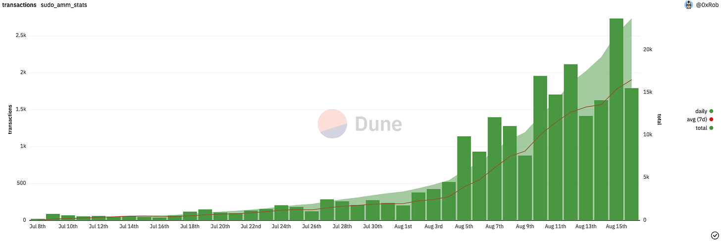 Over the past week, Sudo has seen about ~13,000 transactions accounting for 4,000Ξ in volume. Over 4,000 traders used Sudoswap for the first time this week, about half of their all-time users. Compare these numbers to X2Y2, the marketplace currently leading the race for second place, which saw ~8,000Ξ of volume from ~40,000 transactions. While Sudo may not keep up this pace, it’s easy to imagine them becoming a true competitor - especially considering they’ve not yet been integrated with aggregators like Gem and Genie.