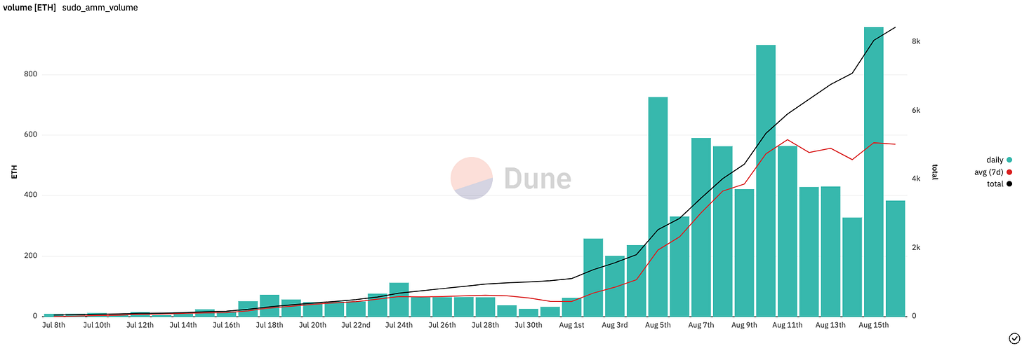 Sudoswap also has a lot of growing to do, both on the technical side and the community side. Since someone must make a pool before a collection can trade on Sudo, many collections aren’t available there. Over the weekend, users participating in mints through Sudo piled up failed transactions - whether this is due to user error, pool design errors or backend issues, it reemphasized that NFT AMMs are still rather uncharted territory that might need some patching up. Still, it will be exciting to watch this develop over the coming months.