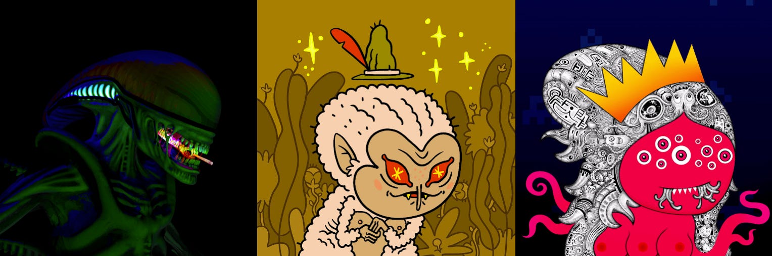 After a week of trading that saw that over 6,000Ξ in volume and a high floor price of ~0.9Ξ, the 8liens have declined over the past few days. The collection features 1/1s from popular and up-and-coming cryptoartists including ACK, Gremplin and Hackatao. Its decline likely speaks more to the state of the current market than the state of the project - despite topping weekly volume charts, maintaining any kind of attention is difficult at the moment.