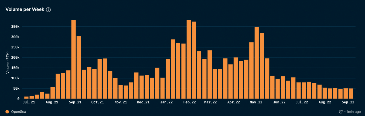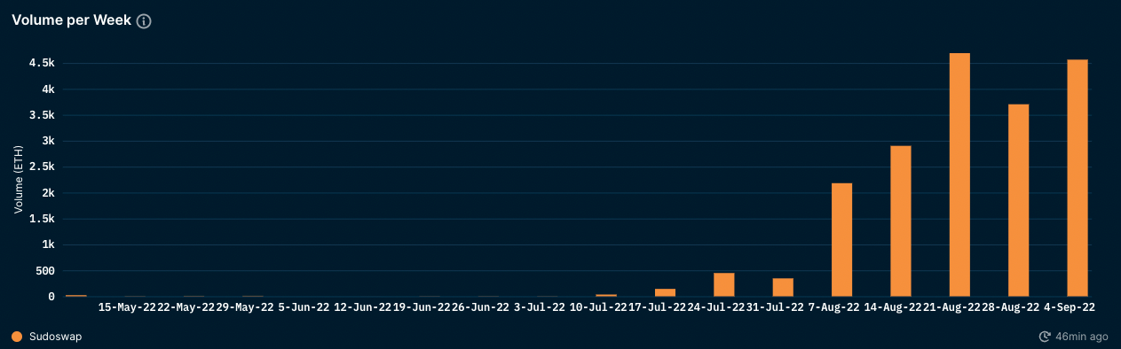 sudoswap has continued gaining traction in the weeks since the sudo-bonanza. Although nascent, the marketplace has shown rather consistent volume. Projects are continuing to experiment with the idea of owning their own liquidity as a method of income that could one day replace royalties. As more collections and communities become interested in sudoswap - something their recent $SUDO announcement could spur - the marketplace could become a real contender for second place, or more.