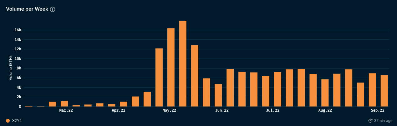 It’s now been a couple weeks since X2Y2 announced the ability for buyers to choose whether or not to pay royalties. Concurrently, sudoswap has been experiencing an increase in exposure as more and more projects and users learn about the NFT AMM. The charts below show weekly volume on OpenSea, X2Y2 and sudoswap respectively. OpenSea saw about 50,000Ξ in volume, X2Y2 about 6,500Ξ and sudoswap about 4,500Ξ.