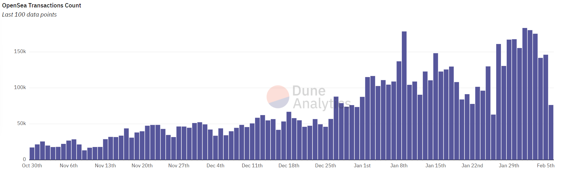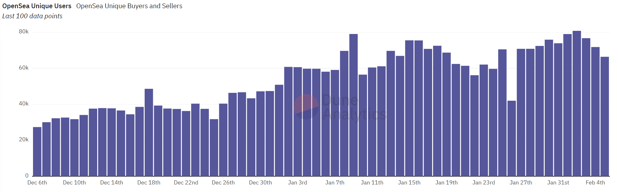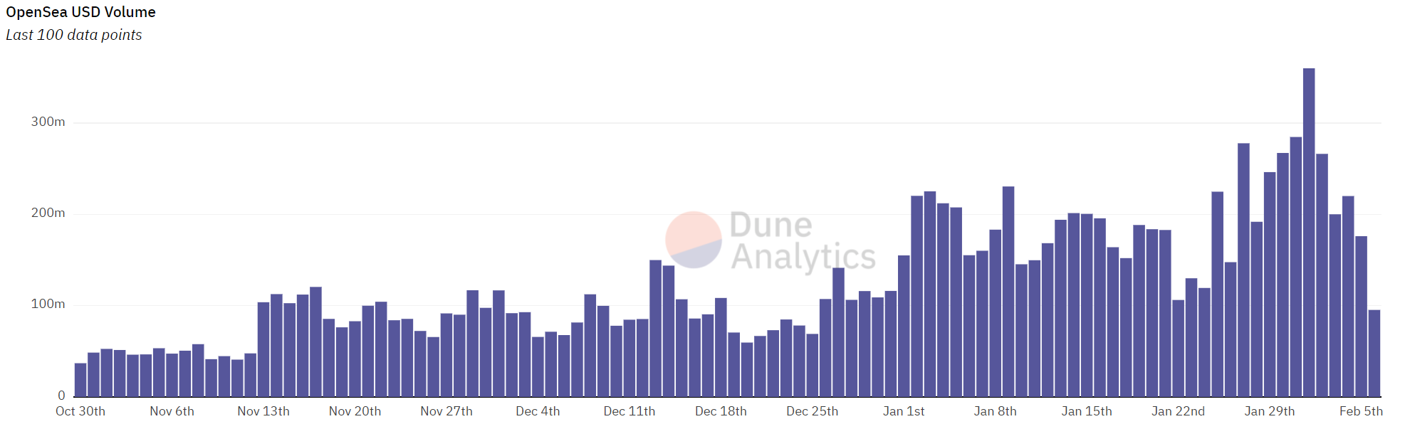 following record-setting volume last week, the market has slowed down a bit but continues to show strength. volume and unique users over the past few days are in line with trends from before the peak in volume on Feb 1. users are still showing up every day and trading, but are doing so with cheaper collections than on the 1st.