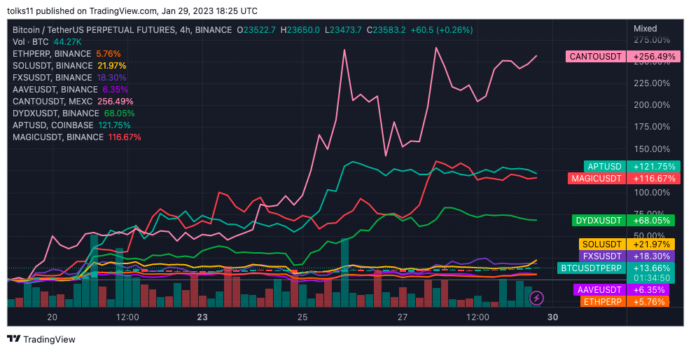 January comes to an end with another exciting, opportunity filled week in crypto as the total market cap slowly climbs higher on the back of BTC and ETH providing room for alts to accelerate higher. Canto and Aptos, for the second week in a row, were the largest beneficiaries as the era of web+ and short liquidations continues.