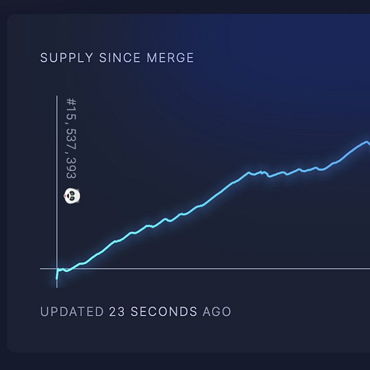 As of Monday morning, according to ultrasound.money, ETH’s supply change since the merge has been increased by ~7.5k ETH ($9.7M). Toggling the display to simulate if ETH was still PoW, we can see that the supply increase would be ~390k ETH ($507M). A massive difference. Demand for ETH and net crypto inflows may remain suppressed for longer, but it’s easy to envision ETH’s coming reflexive appreciation as the narrative of supply reduction becomes self-fulfilling.