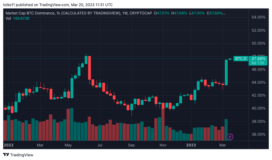Another week has passed and the quintessential cocktail of increasing bank chaos and rising crypto prices was once again in strong demand. BTC responded perfectly to the global banking turmoil as it painted its largest weekly candle since January of ‘21 and has gained an impressive ~40%+ since March 6th’s 19.6k lows.