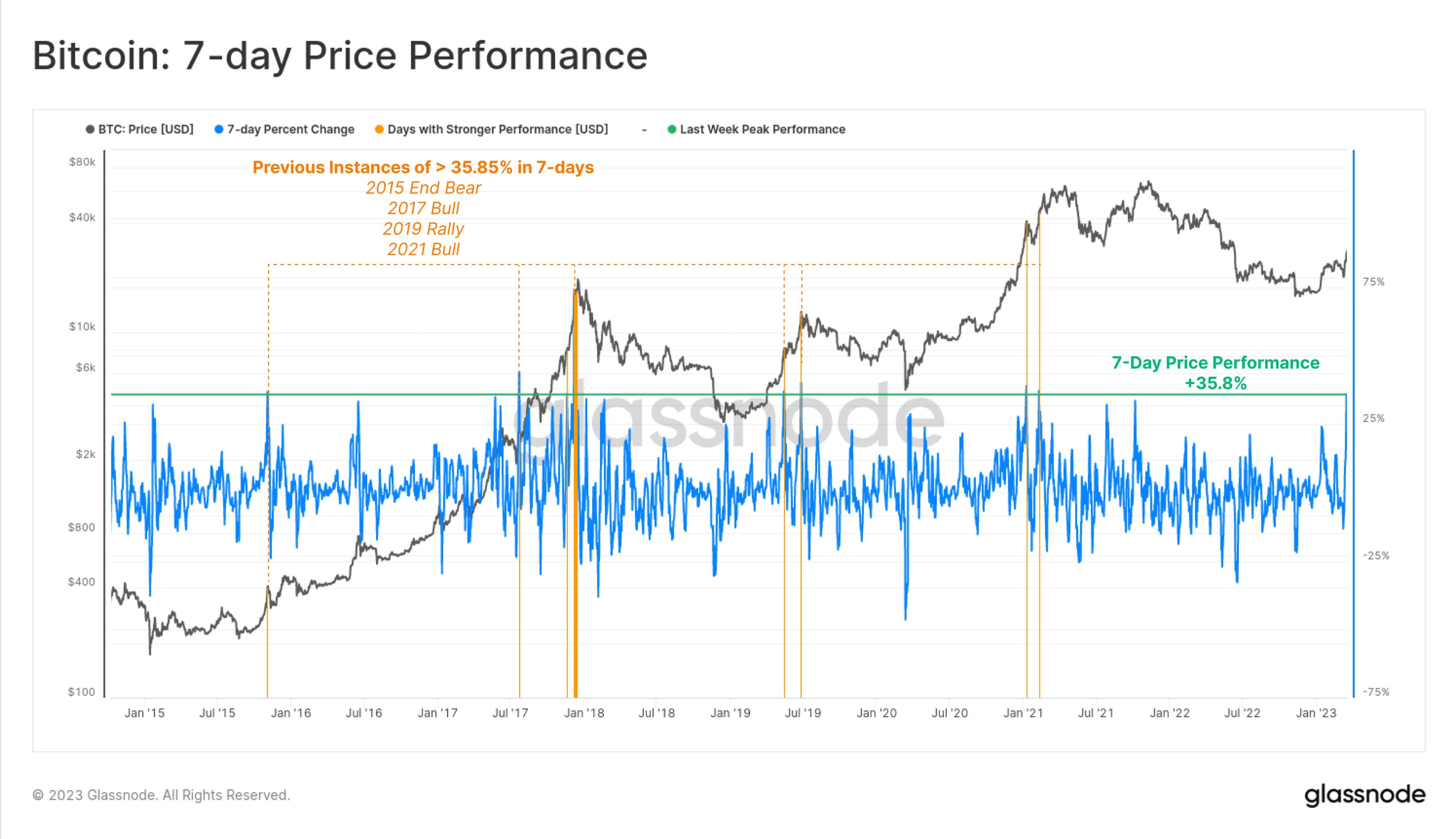 As you can see from Glassnode’s image below, 7-day price rallies greater than 35% have historically been strong indicators for bull market conditions. With that being said, the sample size is obviously small and the corresponding macro conditions were far more accommodating in previous instances. Despite that, BTC was created in response to the exact chaos we’re seeing in the global banking sector and benefits from being the most useful bearer asset in existence, provides a deeply liquid, global, 24/7 market and is uniquely positioned to be one of the purest expressions of change in the Fed/global banking liquidity.
