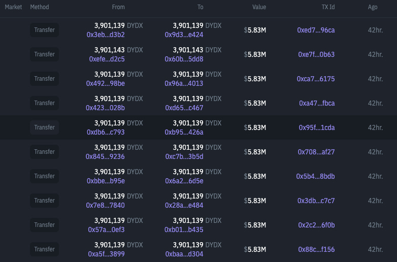 Monitoring dYdX’s move and the building narrative surrounding app-chains in the coming months as L2’s continue to build and optimize their scaling solutions should be an interesting dynamic. While it’s unclear how the move will be perceived in the long term, large market participants were moving dYdX tokens as a result. According to DexGuru’s dYdX token profile transactions tab, sorted by transfers greater than $1M, we see $46.6M worth of token transfers likely responding to the announcement.