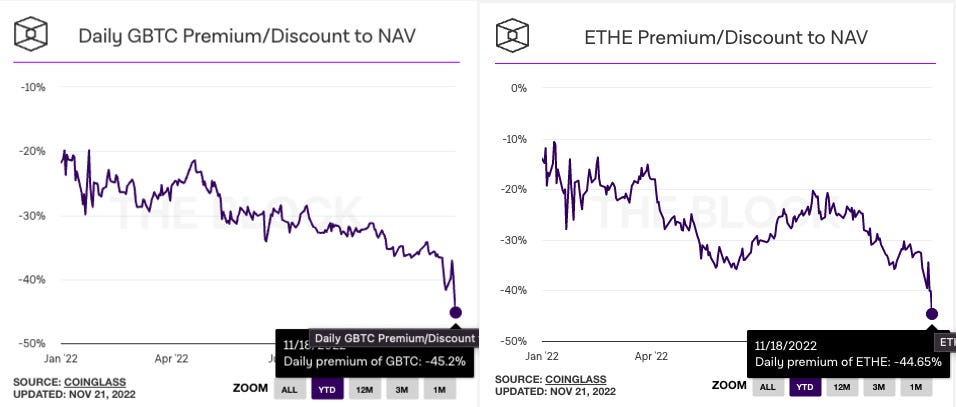 Before officially suspending redemptions, Genesis was seeking an emergency loan of $1B which further ignited the rumor mill around the solvency and future of both Genesis and Grayscale. As mentioned, Grayscale is the issuer of the GBTC and ETHE trusts which hold ~633k BTC and ~3M ETH. Obviously, FUD began to ensue as market participants speculated that DCG will begin to liquidate and/or restructure its assets, including the massive GBTC/ETHE trusts, to pay its debt.
