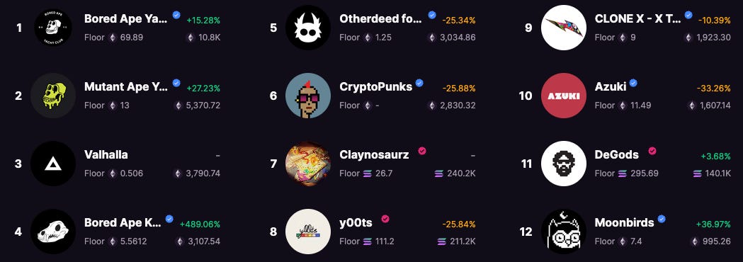 Despite the heightened negative sentiment, SOL ecosystem participants have shown life and a willingness to use the chain for NFTs. As the below picture shows, the demand for SOL-based NFTs is on par with, and sometimes exceeding, the largest and most established collections on ETH.