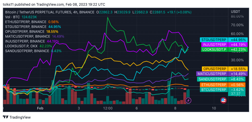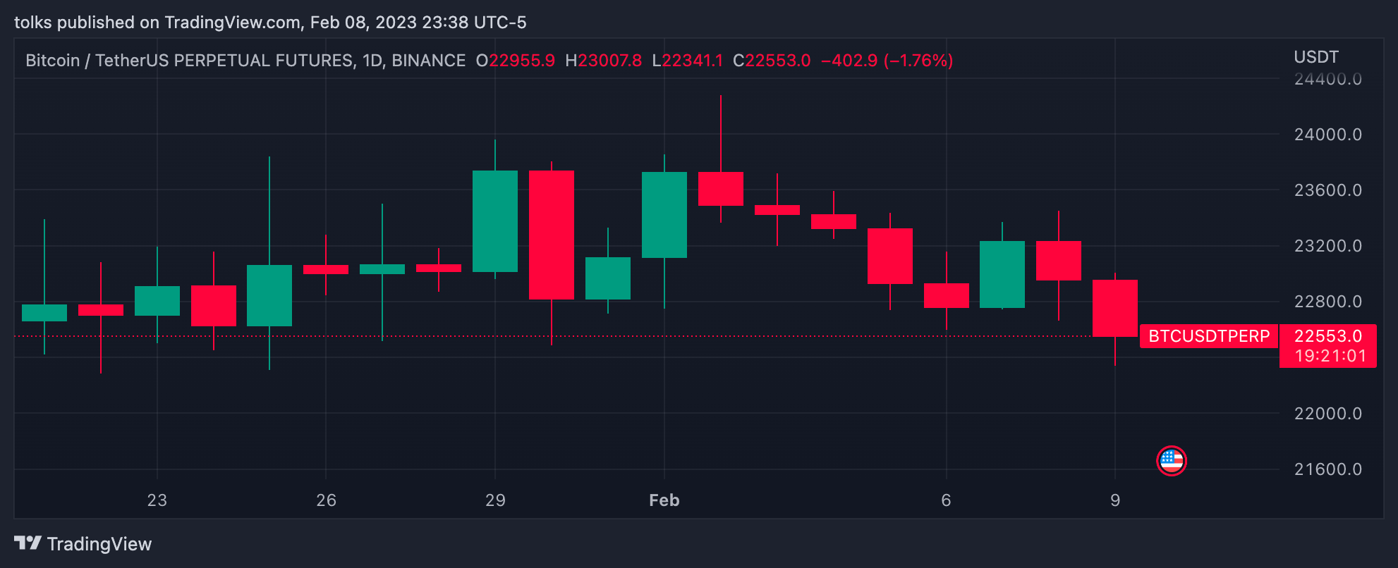 The past few weeks are a great example of this as the above picture shows that BTC’s price today, ~22.6k is effectively the same as it was on January 20th while also being down ~7% since the recent 24.3k peak a week ago. Importantly, in the two weeks prior to that screenshot, BTC went from 16.8k to ~22.6k, something I’m expecting to see often throughout the year. As the old adage goes, two steps forward, one step back.