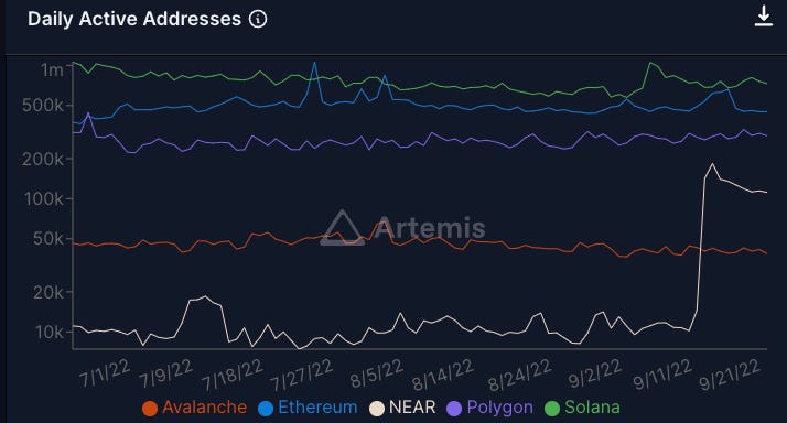 As you can see, NEAR daily transactions have sky-rocketed this week from 10.2k to peaking north of 183k. This sudden, massive increase is the result of the launch of Sweatcoin (SWEAT). SWEAT is similar in nature and design to the once popular STEPN, as users are rewarded in SWEAT tokens for their movement. Admittedly, I haven’t personally analyzed the tokenomics, token sinks, and sustainability of the SWEAT ecosystem, but the ability to onboard users to crypto rails is unquestioned.