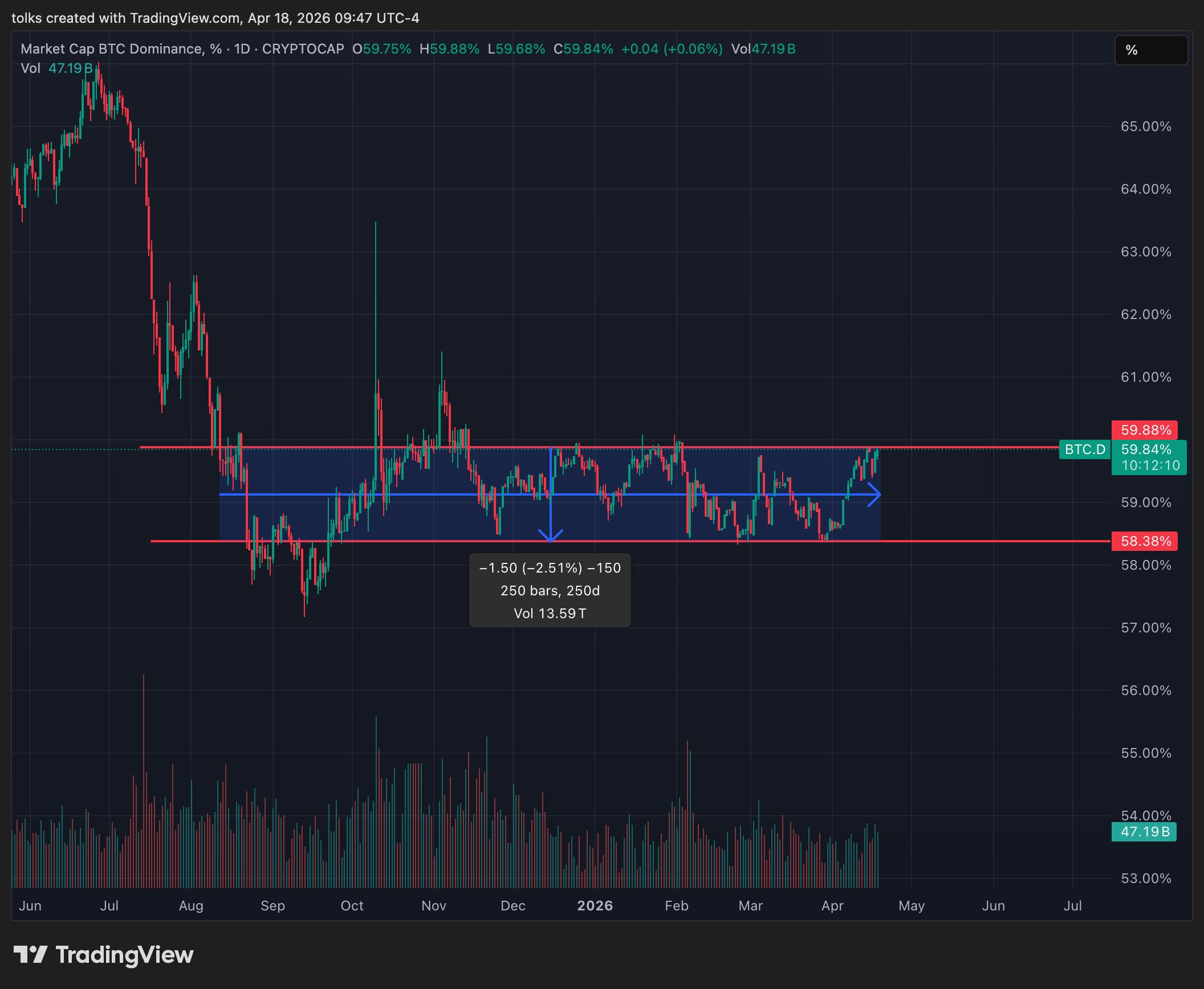 Nothing has, or likely will, change in that regard and I’m hoping that HYPE strength and SOL weakness continues to signal healthier markets and the potential for more upside to come. One other chart I’m watching closely is BTC.D.