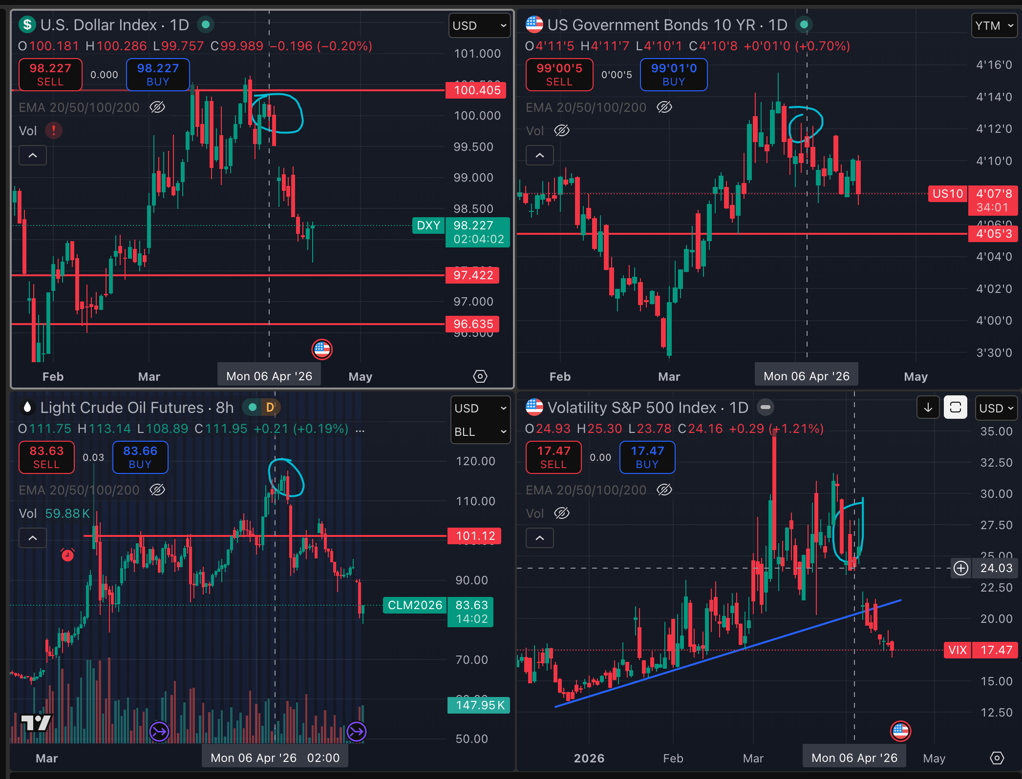 “And finally, for the good news, if that doesn’t happen and things are more or less wrapped up in a couple weeks then hope wins out, at least in the short to mid term, through the aforementioned charts of oil, dxy, yields and the vix.