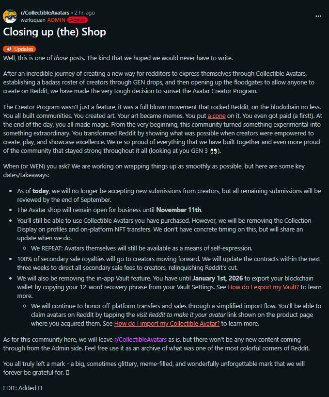 The Reddit team has announced that they’re sunsetting the Avatar project.