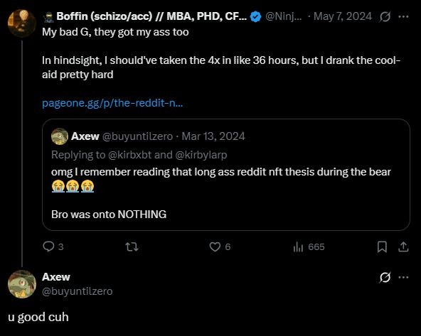 This stings quite a bit, not because I invested (and I guess subsequently lost) a fair chunk of change on this bet, but rather that I believed that Reddit (out of all companies) had a real shot of actually pulling this off and being a widely accepted way of creating, advertising & selling these Collectable Avatars. This also marks the only instance where I’m making an edit to a published post.