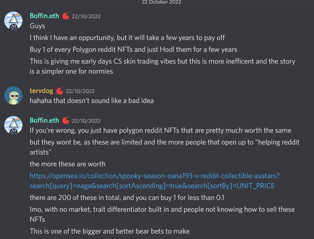 Funnily enough, Reddit is more of a metaverse than 99% of web3 (and even web2) firms that have claimed to be creating their own metaverse. The big difference here is that it’s almost entirely text-based. With the addition of NFTs to their platform, I’d wager they have this expansion in mind. The metaverse was never going to be invented, it already exists. It was always going to be adapted for.