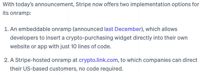 Stripe Embeddable Onramps — Stripe introduced their Stripe-hosted-fiat-to-crypto onramp (includes built-in fraud tools and identity verification to support companies in meeting KYC and compliance requirements). Stripe, “today announced [their onramp]…making it easier for Web3 companies to help US-based customers purchase crypto…Stripe’s onramp allows customers to purchase crypto at the precise moment they need it.”
