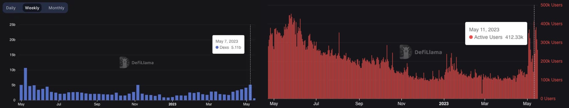 We can argue back and forth ad infinitum about the importance of cheap fees and users’ demand for them, wether they flee ETH due to fees, how much that matters, and how it’ll play out heading into next cycle but what I think is the clear takeaway outside that debate is that crypto activity moves in unison. The parabolic rally of PEPE and other memecoins on ETH rejuvenated energy and attention to crypto which benefitted *all* chains when looking at metrics (volume, DAUs, etc.) throughout May.