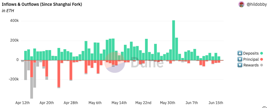 Despite the irrational fears of a “death spiral” and broad ETH selloff due to staked ETH withdrawals finally being enabled, the polar opposite has occurred. The entry queue for new staking validators sits at 40+ days long while the withdrawal queue, outside of Celsius, has been largely inactive allowing anyone wanting to remove their ETH free to do so at anytime. As you can see, the cumulative total of locked ETH has steadily and continuously moved up and to the right with the net flow since Shanghai resulting in 3.58M additional ETH staked.