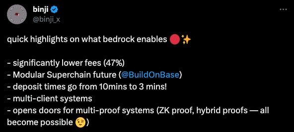 Optimism’s Bedrock enables the Superchain thesis to take shape; a potential influx of tens of millions of users could be onboarded to OP’s stack within the next 12-24 months through Base & Worldcoin but OP value accrual is paramount