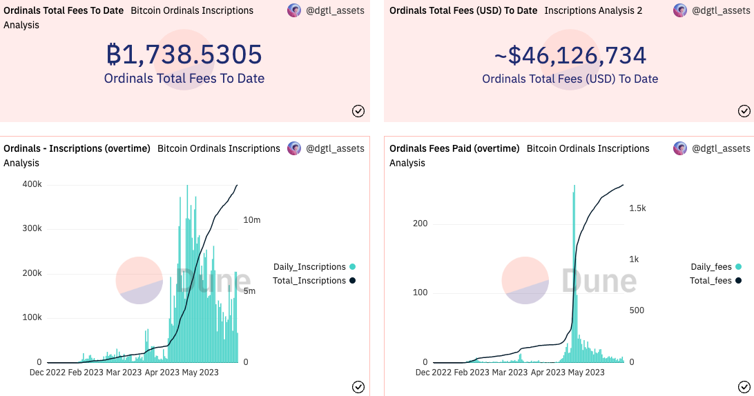 Outside of the memecoin insanity that was taking place on ETH, the biggest story of the last several months is undoubtedly BTC Ordinals, Inscriptions, and BRC-20s. The ability to create, trade, and purchase what we colloquially know as fungible tokens and NFTs on BTC has rapidly escalated throughout Q2. There were multiple days in late April and May where an Ordinals collection was the highest volume collection across *all* blockchains according to cryptoslam.io.
