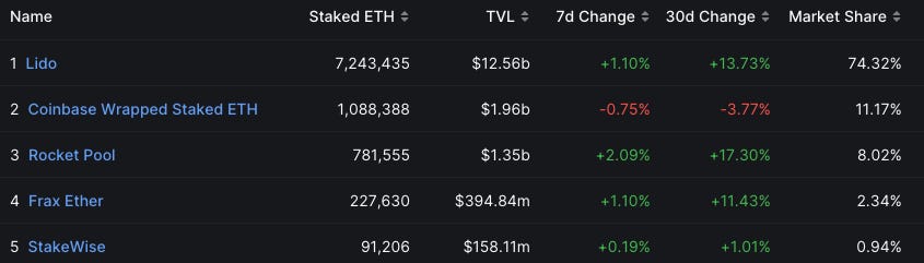 One of the downstream effects of ETH’s burn rate increasing through amplified onchain transactions is the boosted MEV extraction and priority fees (hello, jaredfromsubway.eth) that are eventually passed down to higher staking APRs. With that in mind, let’s take a look at the liquid staking market since Shapella went live.