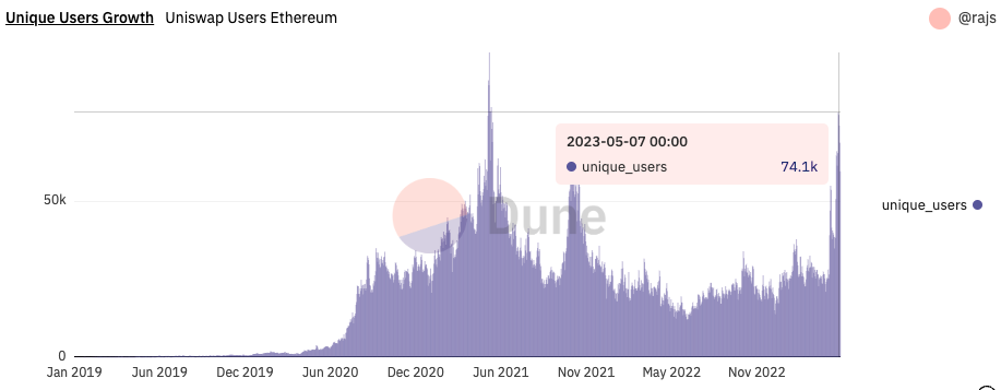 As you can see from the chart below, unique Uniswap users hit 74k+ on May 7th, a level that hadn’t been reached since around the peak of the bull market in May of 2021 (also aligning with almost prefect local tops of ETH and BTC). DEX volumes have skyrocketed as capital has rotated from the stagnant NFT market and choppy majors price action to chase the volatility and volume spikes in memecoin land. Once again, while the peak insanity has calmed down in the same vein as BTC Ordinals, the ability to generate headlines and FOMO severely aids crypto’s growth.
